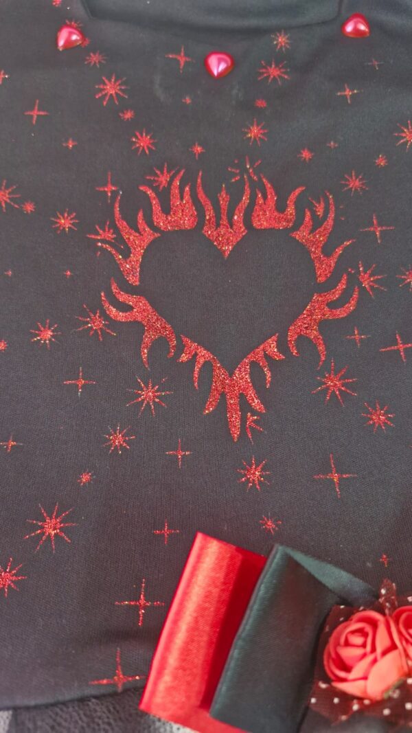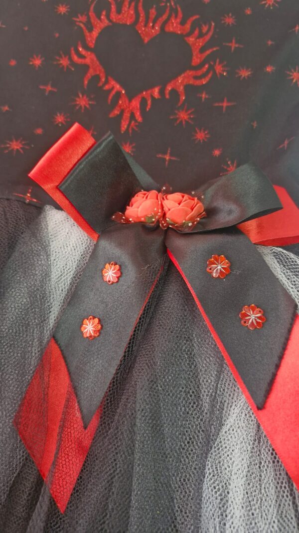 Composição: Corpo de malha com aplique em glitter, saia de tule e saiote de TNT