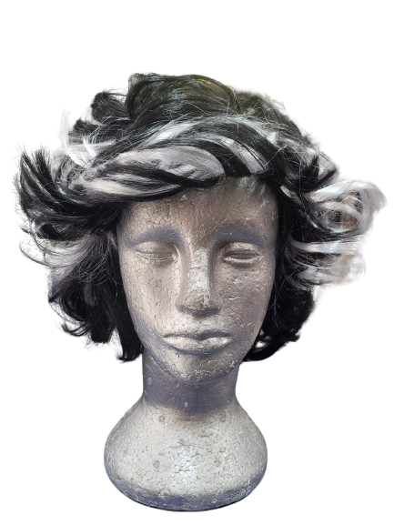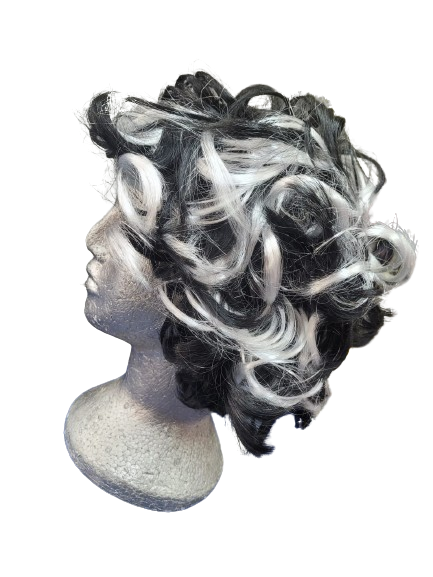 Inspirada na icônica vilã dos filmes, a peruca apresenta o clássico contraste preto e branco, com corte curto e volumoso, garantindo um visual autêntico, elegante e cheio de atitude.